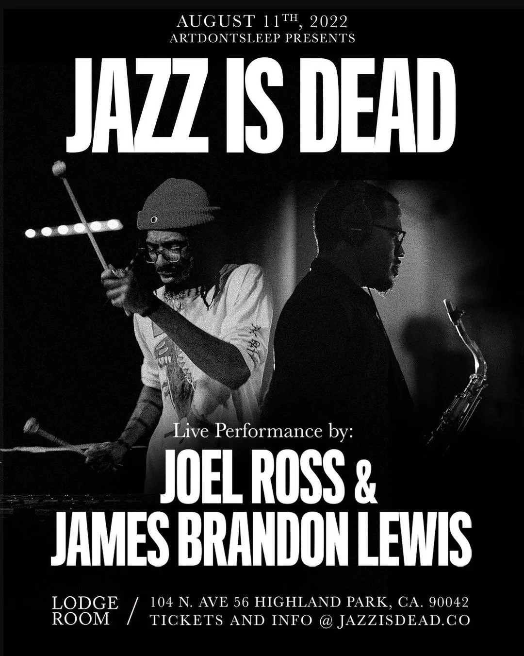 Jazz Is Dead invites you to witness two emerging vanguards of the new sound, as vibraphonist Joel Ross and saxophonist James Brandon Lewis convene on the Lodge Room stage for one night, giving listeners a glimpse into the bright future of Jazz. Both artists are accomplished improvisers and composers, and have swiftly moved up the ranks to become championed by critics and fans alike.